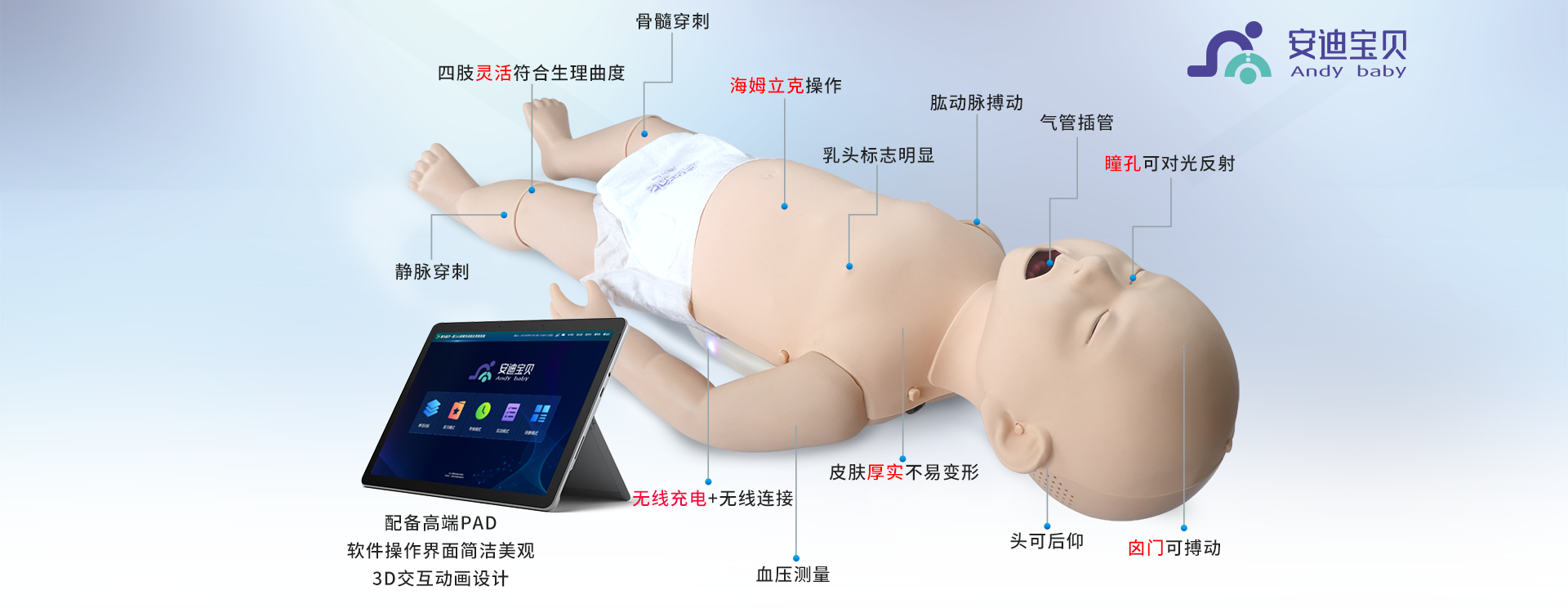 糢擬人爲高分子材料,環保(bao)無汚染;解剖標誌明顯,可觸及兩乳頭、肋骨(gu)、胷(xiong)骨及劒突(tu),便于撡(cao)作定位。